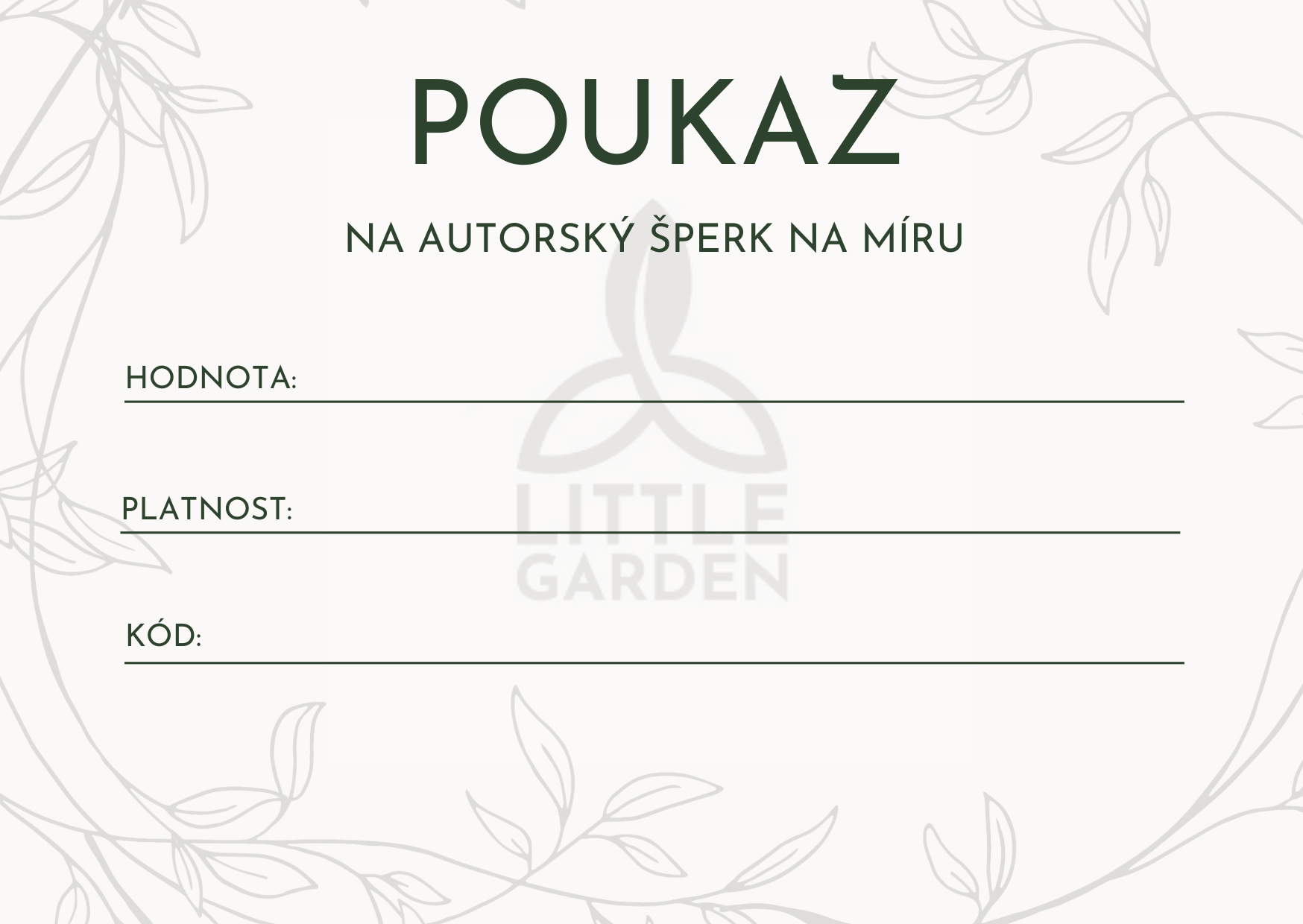 Tento poukaz opravňuje držitele k vytvoření originálního autorského šperku na míru značky Little Garden, vznikajícího po konzultaci návrhu, materiálu a detailů. Výroba šperku probíhá po individuální domluvě. Obvyklá doba zhotovení je 3-6 týdnů od schválení návrhu. Součástí zakázky je možnost vrácení šperku k jedné drobné úpravě (např. úprava velikosti, délky nebo jemného detailu). Náklady na zaslání šperku zpět k úpravě hradí zákazník, opětovné odeslání po úpravě hradí výrobce. Základní cena poukazu zahrnuje výrobu šperku z následujících materiálů: mosaz, alpaka nebo nerez. Dále pryskyřice, sušené přírodniny a komponenty z chirurgické oceli (řetízek, puzety nebo náušnicové háčky). V případě zájmu o jiný kov nebo nadstandartní materiál (např.: stříbro, zlacené komponenty, pozlacené stříbro, apod.) je možné šperk vyrobit za příplatek dle aktuální ceny materiálu a náročnosti zpracování. Výše případného doplatku je vždy sdělena předem při schválení návrhu. Poukaz nelze směnit za hotovost. Při ztrátě jej nelze nahradit. Poukaz lze uplatnit jen jednou. Uplatnit poukaz lze po domluvě e-mailem: littlegarden@email.cz nebo prostřednictvím Instagramu: littlegardencz.