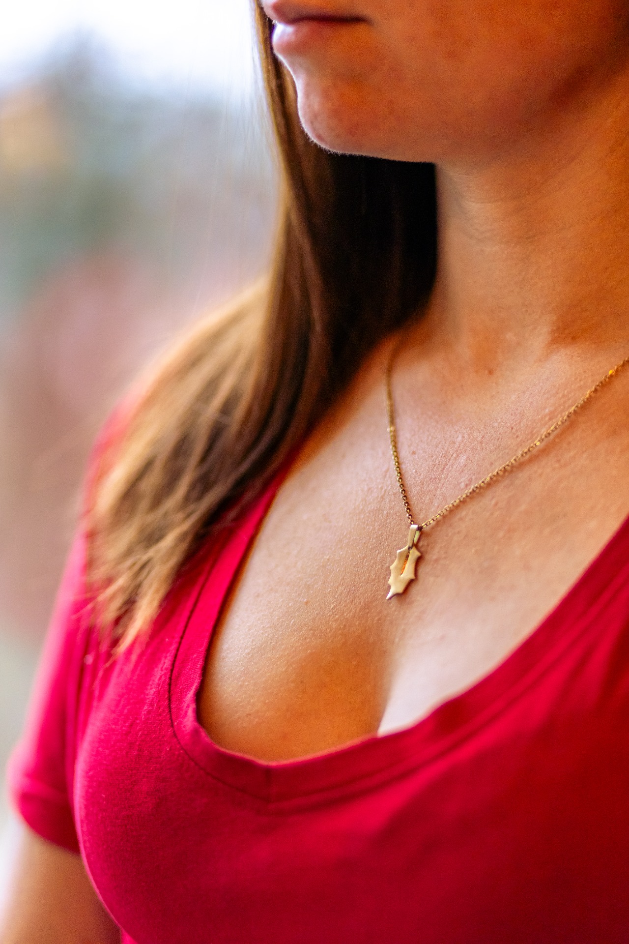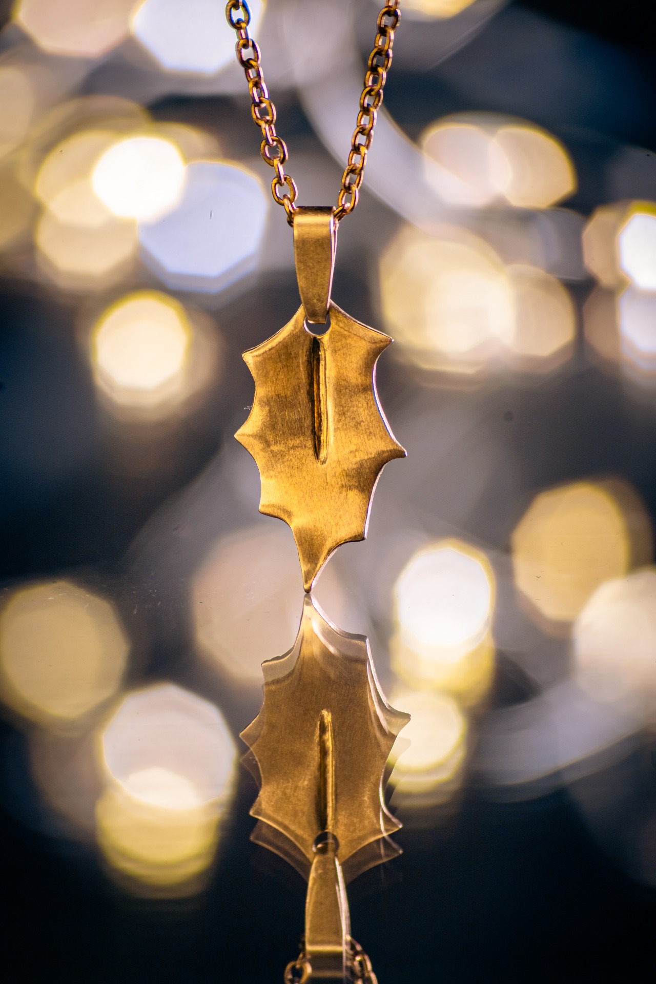 Minimalistický přívěsek ve tvaru cesmíny. V keltské tradici cesmína symbolizuje stabilitu v temném období roku, rodinné pouto a bezpečí domova. V moderní době se také stala symbolem vánočních svátků a zimní pohody.